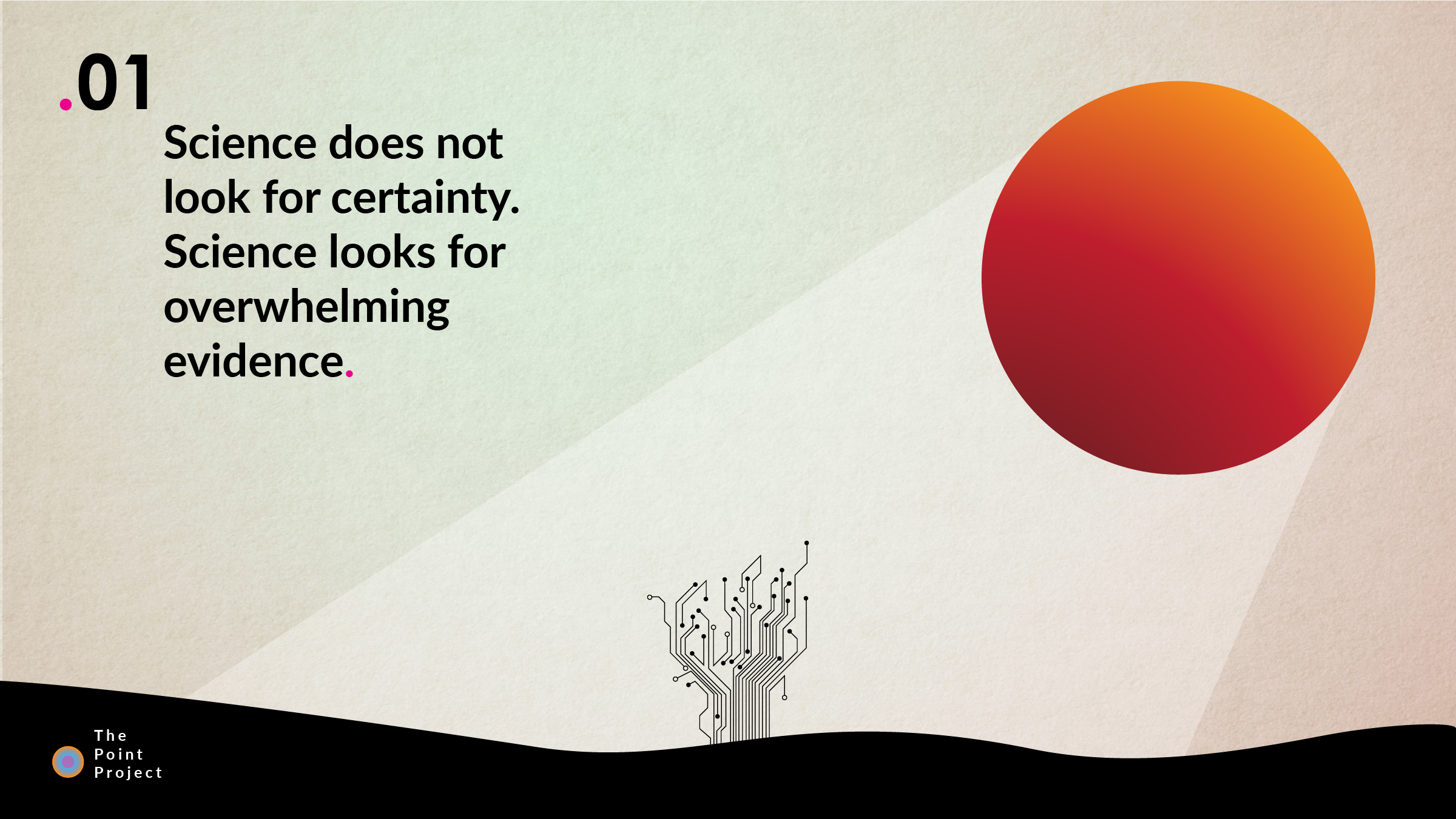 This approach focuses on the unknown and how science interprets and communicates evidence, risk, and reward. It explores the difference between evidence and proof, the relationship between scale and experience, and the dissonance between trust in process versus faith in the individual.